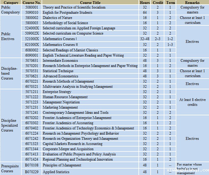 The minimum course credit for postgraduate students is 26 including at least 6 credits of curriculums with the number starting with six (see the following chart). For those postgraduate students whose bachelor degree is not management, they should additionally learn following two courses: Principles of Management and Applied Statistics. Students who passed the examinations would get relevant course credits.