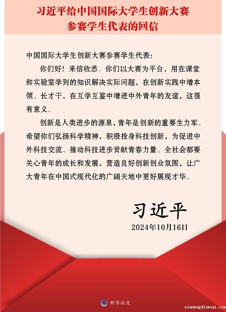 近日,中共中央总书记、国家主席、中央军委主席习近平给中国国际大学生创新大赛参赛学生代表回信,勉励青年学子弘扬科学精神积极投身科技创新,为促进中外科技交流推动科技进步贡献青春力量。此封回信令学院师生倍感振奋!