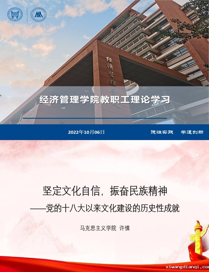 为深入学习贯彻习近平新时代中国特色社会主义思想、党的十九大和十九届历次全会精神,弘扬伟大建党精神,充分宣传展示党和国家事业取得的历史性成就、发生的历史性变革,进一步振奋精神、凝聚力量,在党的二十大召开之际,根据学校党委开展“新时代新成就”宣讲活动的工作安排,2022年10月6日下午,雷竞技新官网登录组织全院教职工理论学习,开展《坚定文化自信,振奋民族精神——党的十八大以来文化建设的历史性成就》专题宣讲活动。本次学习活动邀请了学校马克思主义学院许慎副教授做主题宣讲,以线上和线下形式结合进行,学院全体院领导、党委委员和教职工党支部书记在经管楼809参加学习,学院全体教职工在线上参加学习,会议由学院党委书记武森主持。