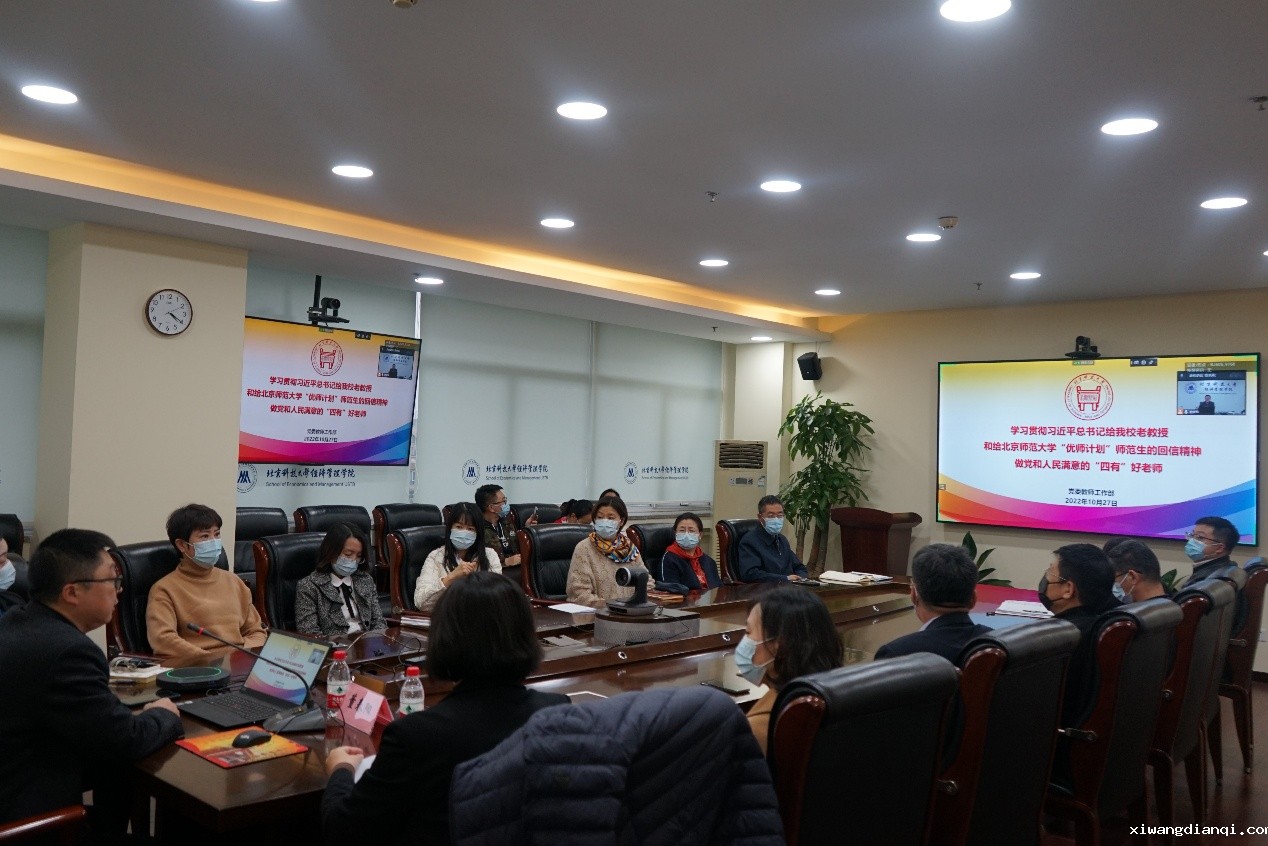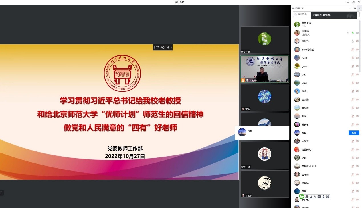 为深入学习领会习近平总书记关于教师队伍建设的重要论述,深刻理解习近平总书记给北京科技大学老教授的重要回信和给北京师范大学“优师计划”师范生的重要回信精神,进一步加强教师思想政治和师德师风工作,根据学校2022年党风廉政宣传教育月活动安排,2022年10月27日下午,雷竞技新官网登录组织全院教职工理论学习,开展师德师风专题教育培训,邀请学校党委教师工作部部长董春阳以《学习贯彻习近平总书记给我校老教授和给北京师范大学“优师计划”师范生的回信精神做党和人民满意的“四有”好老师》为主题进行主讲。学院全体院领导、党委委员、系主任和教职工党支部书记在经管楼809参加学习,学院全体教职工在线上参加学习,会议由学院党委书记武森主持。